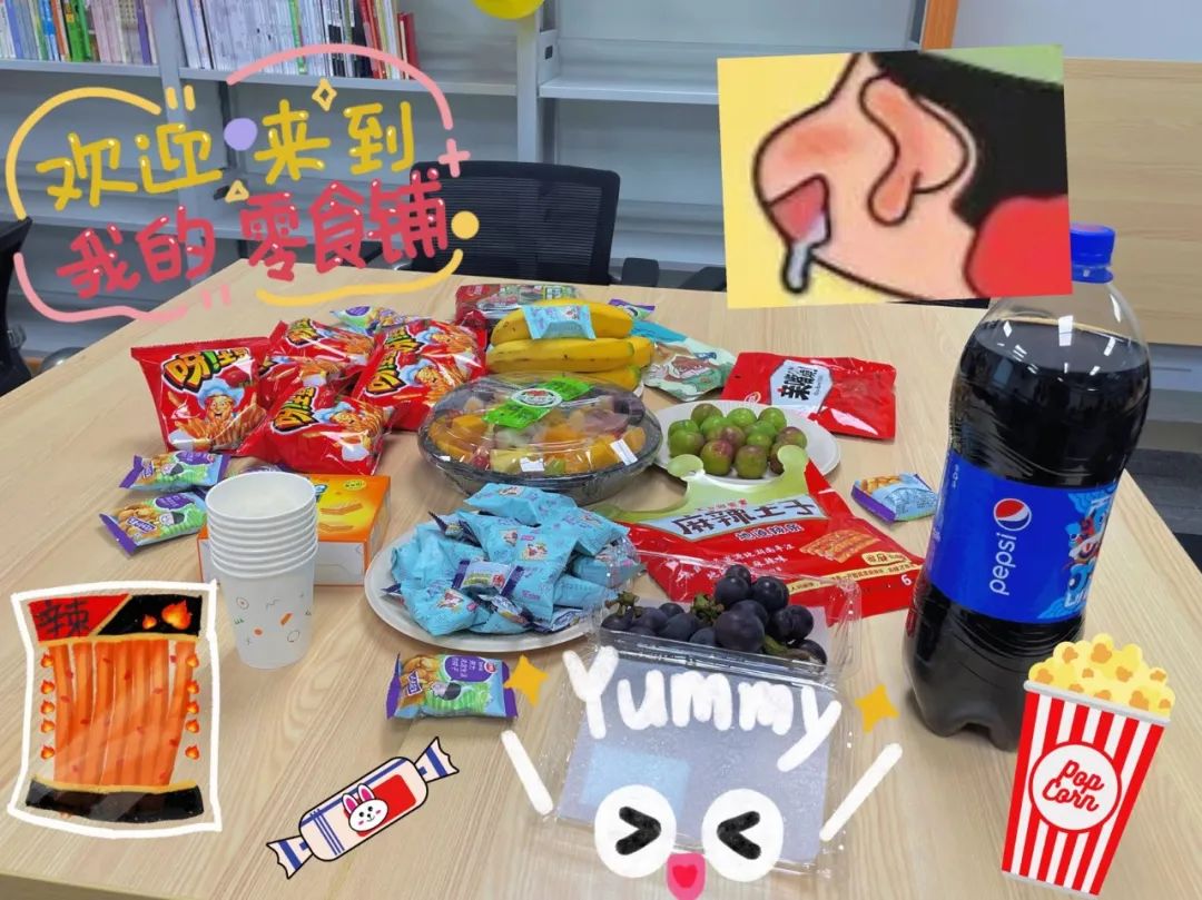 率先到場(chǎng)的壽星品嘗著(zhù)美味可口的零食與水果。